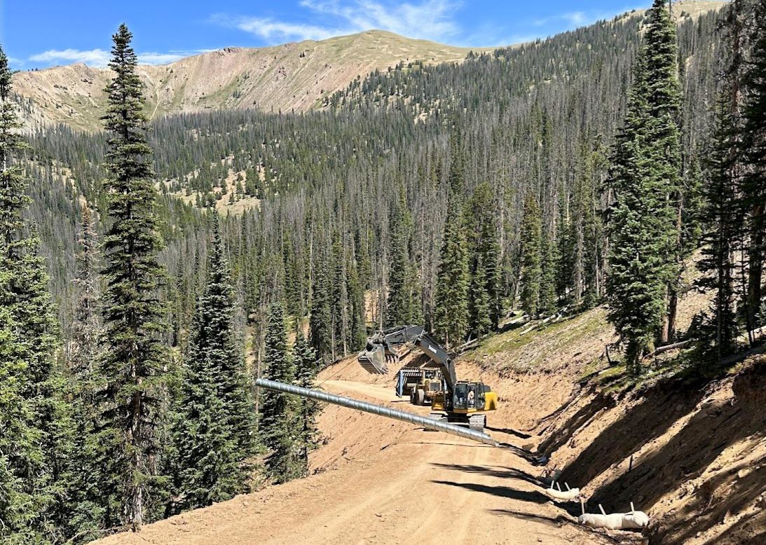 Lowry Contracting is putting the finishing touches on the summer road in No Name Basin. This road access to the bottom is complete and final grading is now underway. The road design also includes the installation of nineteen culverts to provide drainage under the roadway. The last of these on the lower roadway were installed this week. These culverts are 18″ Corrugated Metal Pipe (CMP) and require a multi-step process to install. Luckily, we have Lowry Contracting here to do the heavy lifting.