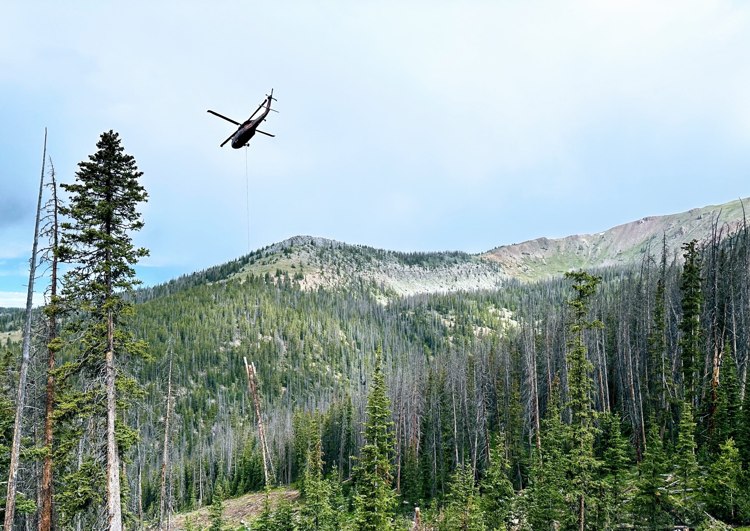 While the bird was on site, we took advantage in flying out some timber from one of the NNB trail corridors. These trees were located in a wetland area on the lower reaches of the “Ambush” ski trail. We worked to minimize impact to this area by cutting trees in March, skidding what we could with snowcats over snow, and then using aerial ops for removal of the remaining trees. Many of the trees in No Name Basin have unfortunately been affected by the Spruce Beetle outbreak that we have been dealing with for many years on the front side of the mountain. Adding ski area operations on this side of the Divide will ultimately give us the opportunity to improve forest health in remaining tree stands, open up habitat, improve defensible space, and provide a fire break for the ski area on the western side of the Continental Divide.
