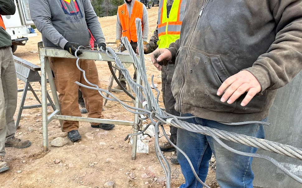 Knight Equipment was on site today to take the lead on the rope splice. This process brings the two ends of the haul rope together into one solid unit. I posted earlier this summer on the arrival of our haul rope and described how the rope is actually made up of several different strands and individual cables. The rope splice…
