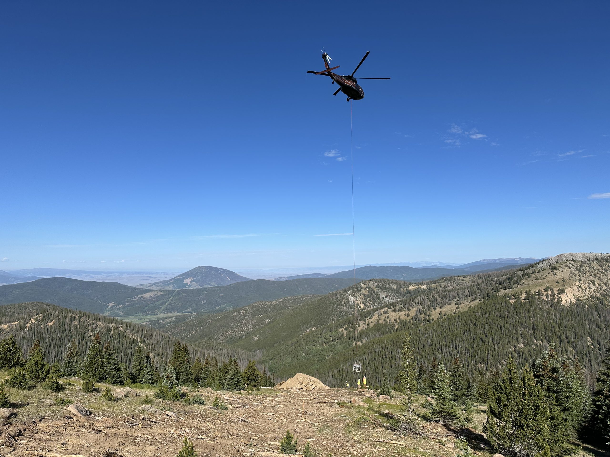 The teams from Skytrac, Timberline Helicopters, and Monarch Mountain worked a solid day this week flying in the concrete for the tower foundations. It took nine concrete trucks arriving at Monarch to fill each bucket one at a time. From the fill station, the buckets were then flown out to the backside of the mountain. Due to our high elevation here along the Continental Divide, the bird could fly just under a yard and a half of concrete at a time with each load of this material weighing around 5000 pounds. It took about seventy turns (out and back) with the helicopter to get all the concrete to each tower along the lift line. Next steps along the lift line are to strip the forms, backfill the concrete, and fly the towers into place. Progress!