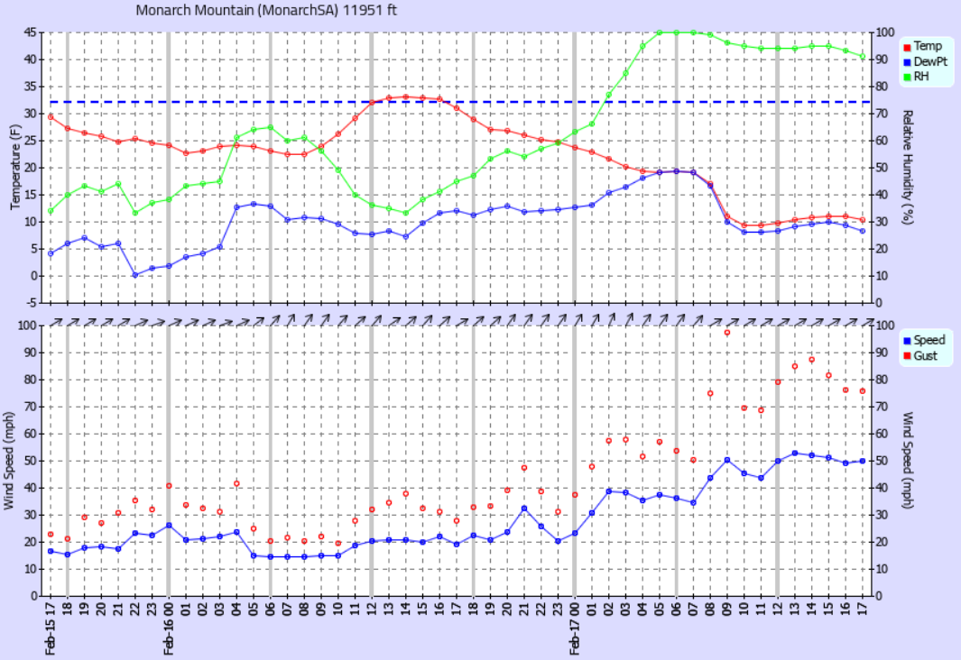 We were anticipating some high winds today and were aware of the potential for a disruption in our operations. When our Mtn Ops team arrived early in the morning, it was windy but there was still the potential to operate a few of our more protected lifts. Between 8am and 9am the winds really started to ramp up and the decision to not operate lifts for the day was clear. The data from our weather station at the top of Mirkwood is shown here.