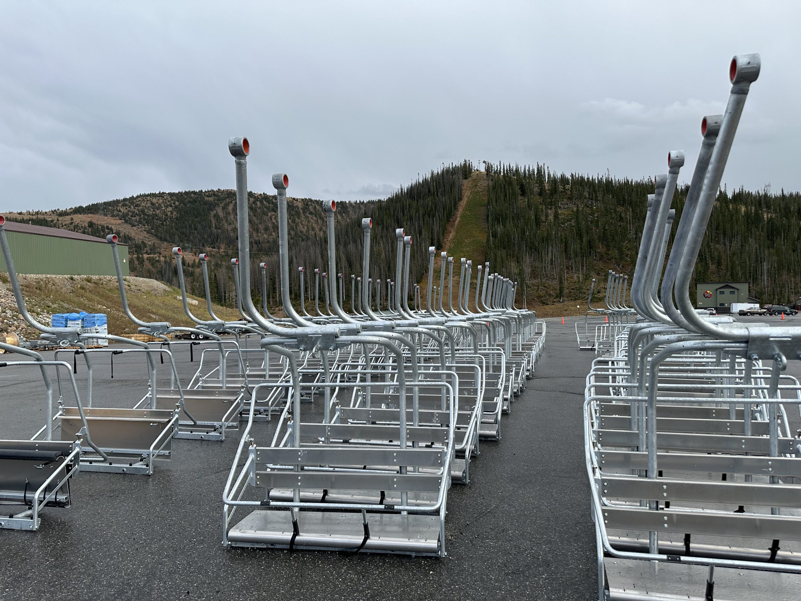 The lift chairs (carriers) have been assembled and are lined up and ready to go. The crew from Skytrac has been working hard to build out the 98 carriers for the new Tomichi Lift in No Name Basin. These three-person carriers still need to have the seat pad, numbers, and grips installed, but they are set to be loaded on trailers for the transfer up to the top terminal. The Skytrac team plans to complete these final steps up at the top and get them installed onto the haul line over the next few days. Stay tuned for some exciting pics and/or video of the fully assembled Tomichi Lift!