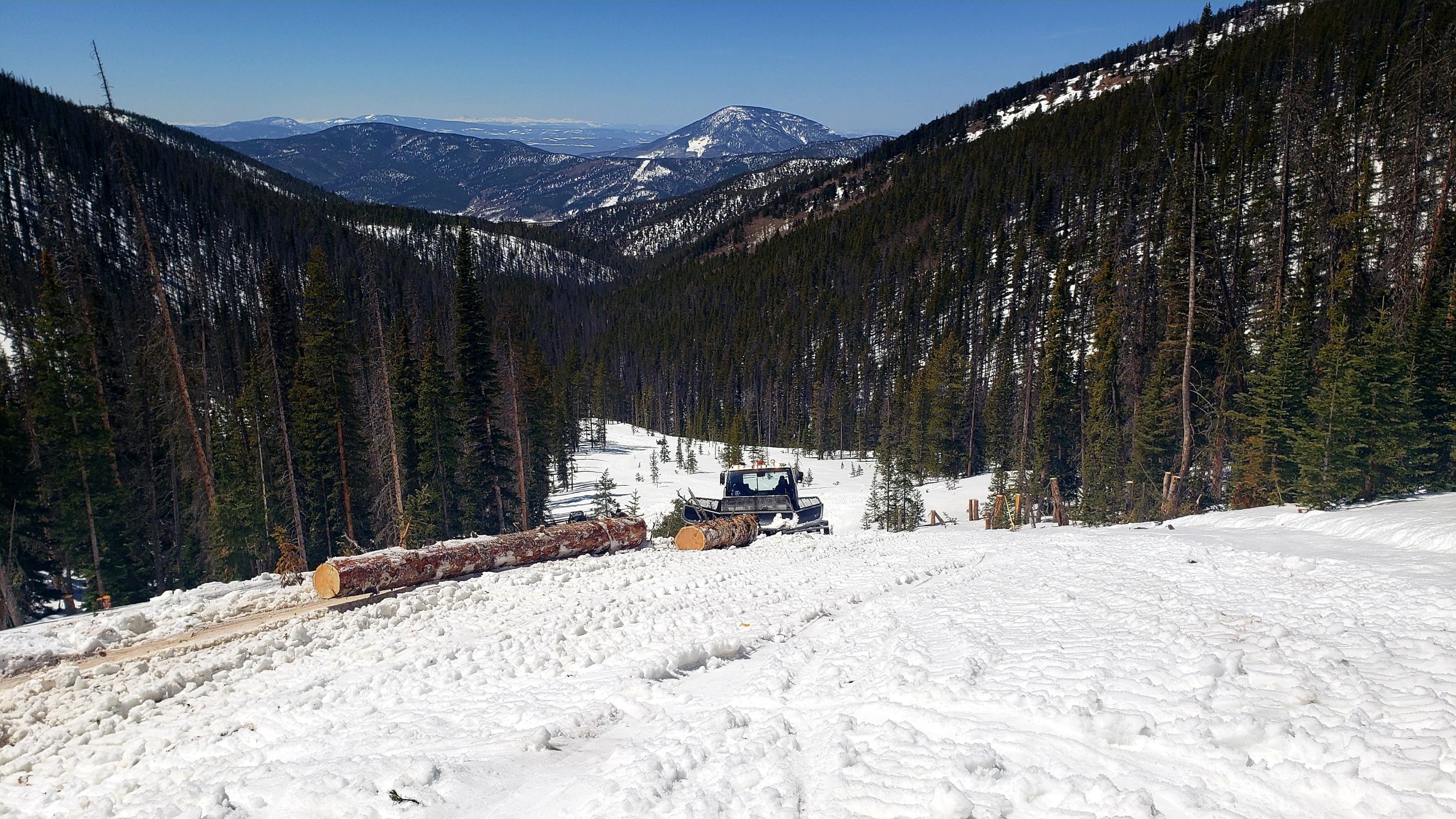 Since closing the ski area, our crew has been busy skidding timber over snow in No Name Basin. We had a few spots where we were unable to operate machinery in last summer due to existing wetlands or other conditions. So, our plan was to address these in spring of 2025 while the snowpack still provided protection for any sensitive ground below. Our team of sawyers went in initially and fell the trees before and immediately after closing the ski area. Our operators and ground crew are now using snowcats to skid the timber to adjacent deck sites that are clear of these riparian zones. The team has been making good progress but we still have a long list of action items in No Name Basin. Stay tuned.