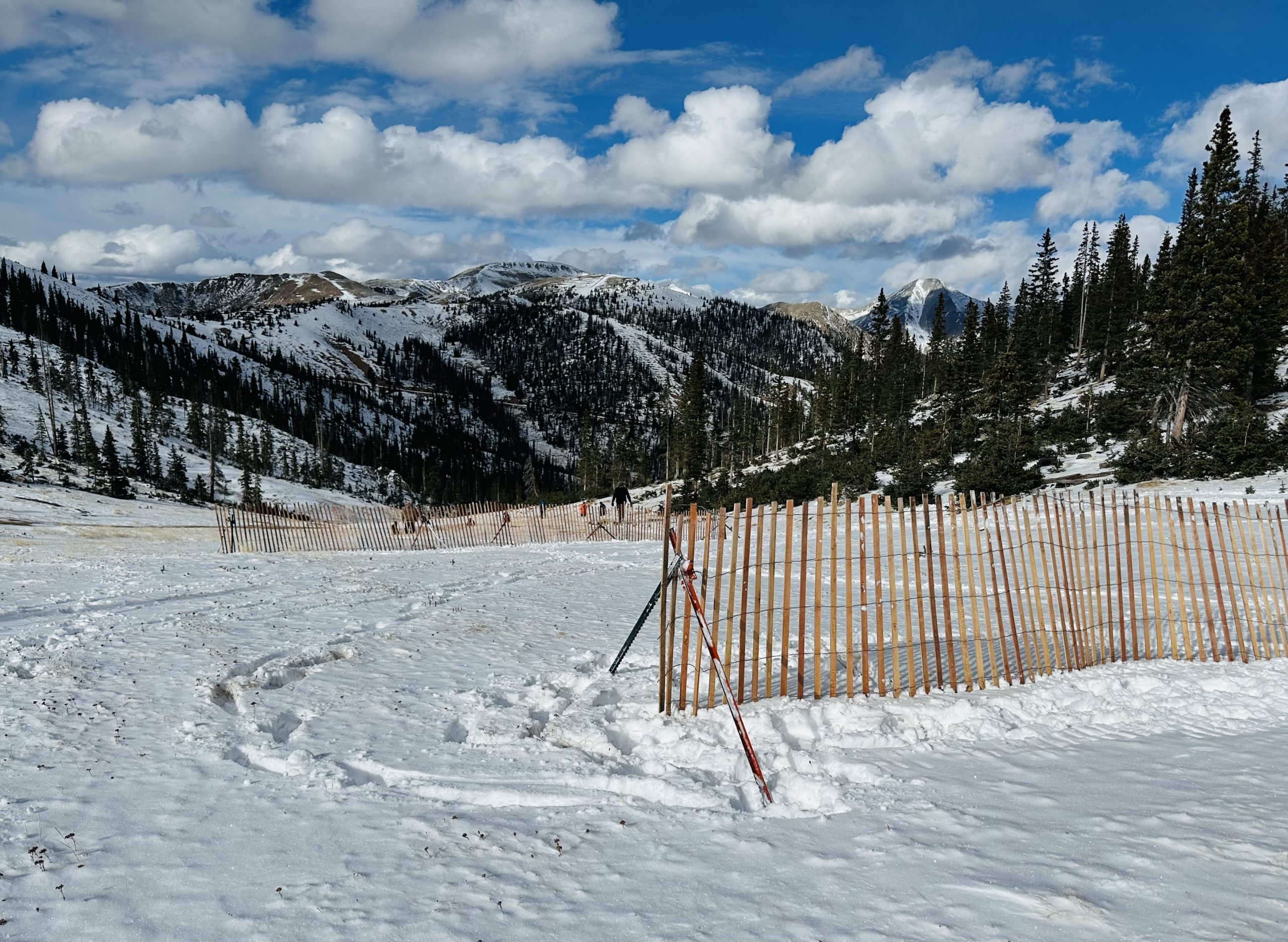 The Mtn Ops team has been out setting up the snow farm. We are one of the last ski areas in Colorado that doesn’t rely on artificial snowmaking in our operation. We understand that while waiting for Mother Nature to deliver can take a little patience, there is nothing better than making turns on real snow. We utilize several strategies in capturing as much snow as we can when the flakes are flying. One tactic is to deploy temporary snowfences that work to collect snow with each passing storm. As winds pass over the windward side of the fence, the wind and snow flakes decelerate leaving piles of snow on the leeward side of the fence. Our cat operators can then push these piles around to nearby areas that may need a bit more coverage. With snow and wind in the forecast for Sunday and Monday, our snow farmers have the fences up and are ready for the snow to pile up.