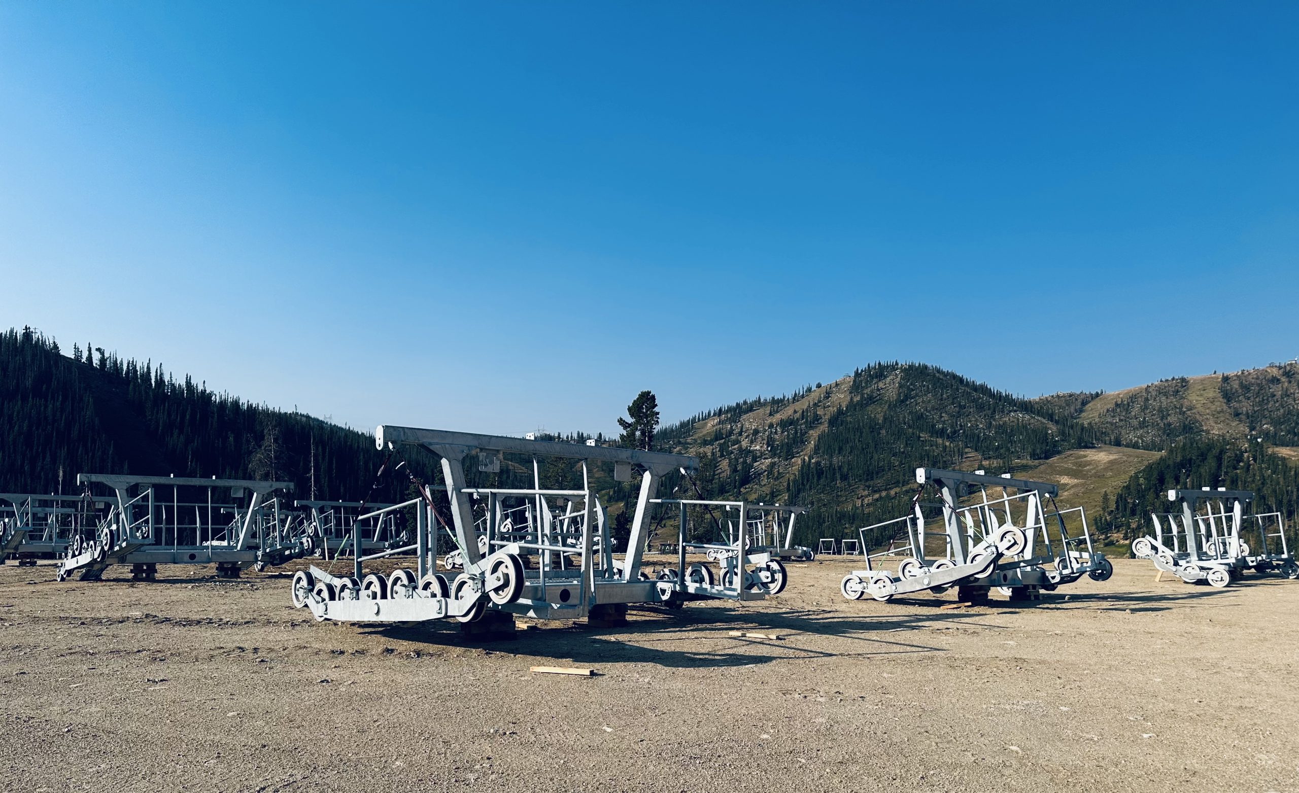 The crew from Skytrac has constructed the tower heads for the new Tomichi Lift. They are sitting up in the Paradise Lot awaiting one more day of flying later this month. Each tower will be flown out to its concrete foundation along the lift line. Immediately afterwards, the individual tower heads will be airlifted from the lot and attached to its tower.