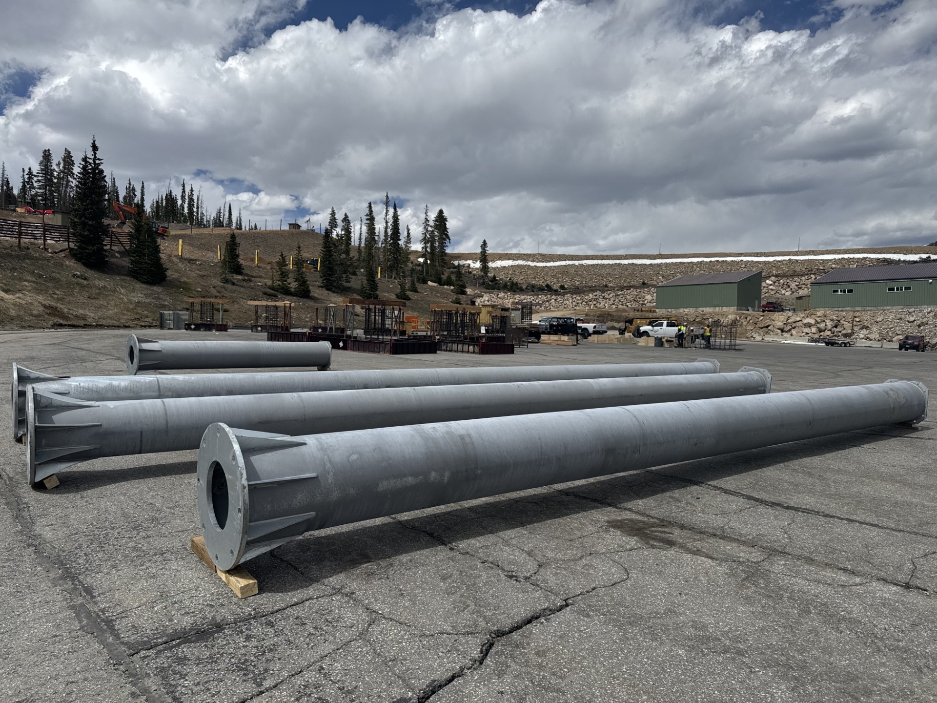 The team from Skytrac Lifts continues to work hard in the parking lot building the tower foundations. In addition to this prep work, we are starting to see other lift parts showing up for the No Name Basin Lift. We recently received a delivery of towers for the lift. Once the foundations are in place and completed on site, the crew will then be able to fly these towers out to the backside of the mountain. Exciting stuff is happening at Monarch!