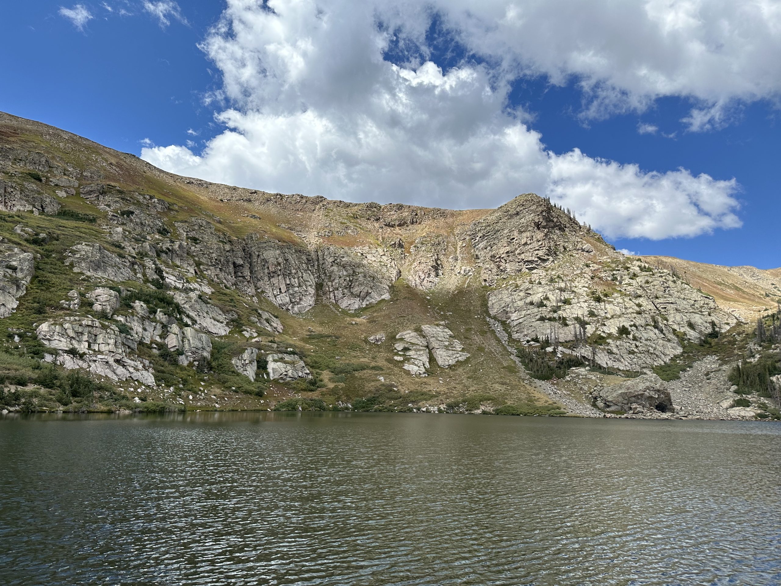 I took a hike up the Waterdog drainage to Waterdog Lakes the other day. Standing at the shores, our Cat Skiing terrain lies directly above this pristine Alpine lake. The rocky chutes to the left of the craggy Monolith can be identified in this photo. Walking around in the summer, its hard to believe that we ski some of the things we do in the winter. Just put two planks or a board on your feet with some metal edges and let the fun begin. Hints of fall are starting to show up and a change of season is in the air.